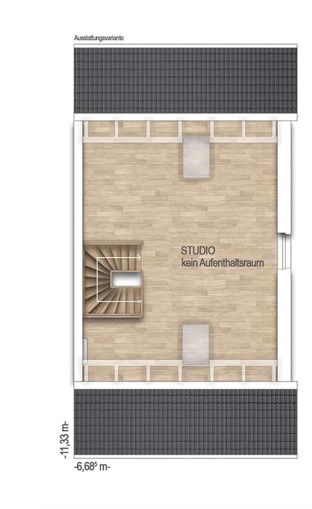 Dachgeschoss: Ein großzügiges Dachstudio, versehen mit zwei Dachflächenfenstern. Dieses ist vielfältig nutzbar. Zum Beispiel als Homeoffice oder alternativ als Gästebereich.